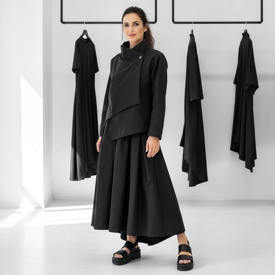 Unsere Auswahl an schwarzer Damenmode zeichnet sich durch extravagante Schnitte aus, die besonders edel wirken. Vergiss figurbetonte Einheitslooks! Wir setzen auf fließende Silhouetten, weite Schnitte, die spielerisch die Figur umspielen, und eine lässige Eleganz, die Komfort und Stil perfekt vereint. Jedes Stück ist ein Kunstwerk für sich, oft mit einem Hauch von Avantgarde, der dich immer stilsicher & selbstbewusst wirken lässt.