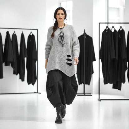 Dieser wunderschöne, hellgraue Bouclé Strick-Pulli von "moonshine" ist in modischer A-Linie mit asymmetrischem Verlauf geschnitten. Die Besonderheit dieses Pullis sind die effektvollen Cut-outs, die einseitig im unteren Vorderbereich angebracht sind.