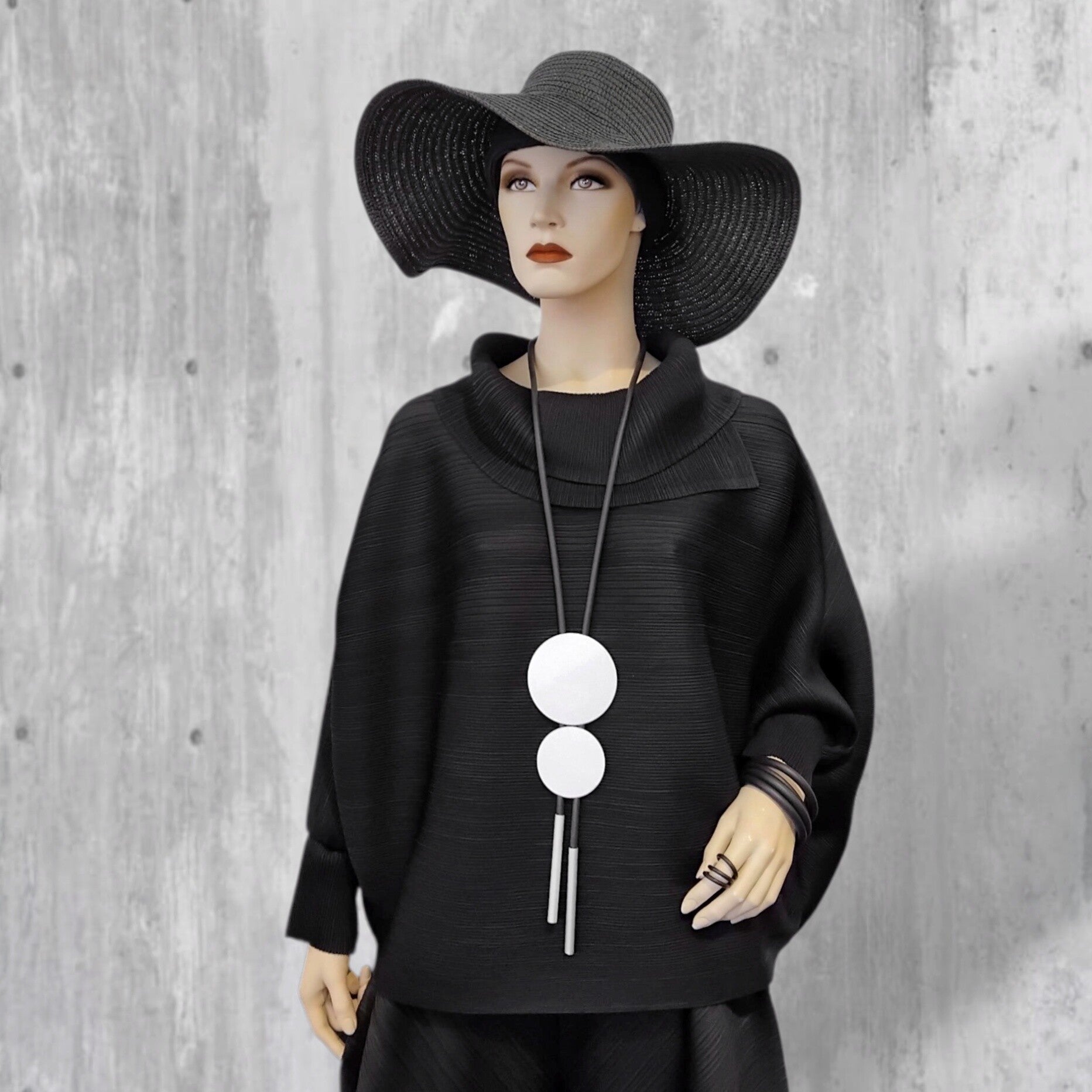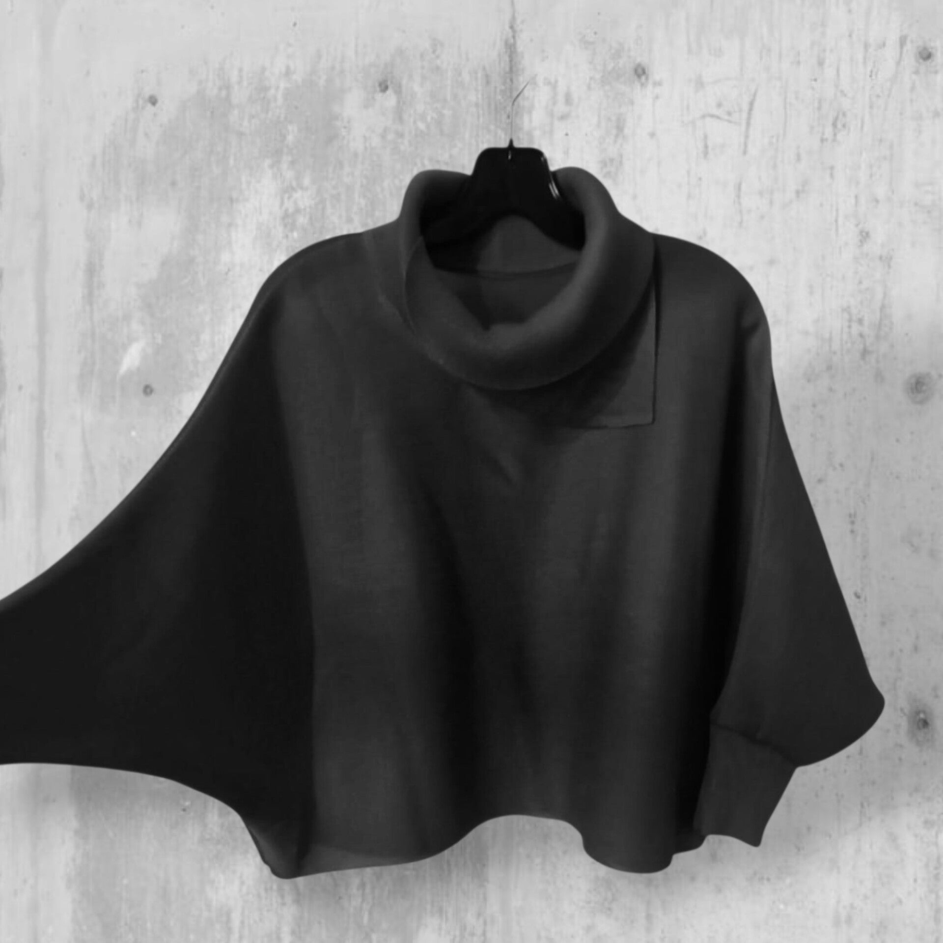 Dieses formschöne, fein plissierte, schwarze Oberteil ist im modischen Poncho-Style geschnitten und hat einen sehr aparten Kragen, der dem Oberteil eine extravagante Note verleiht.