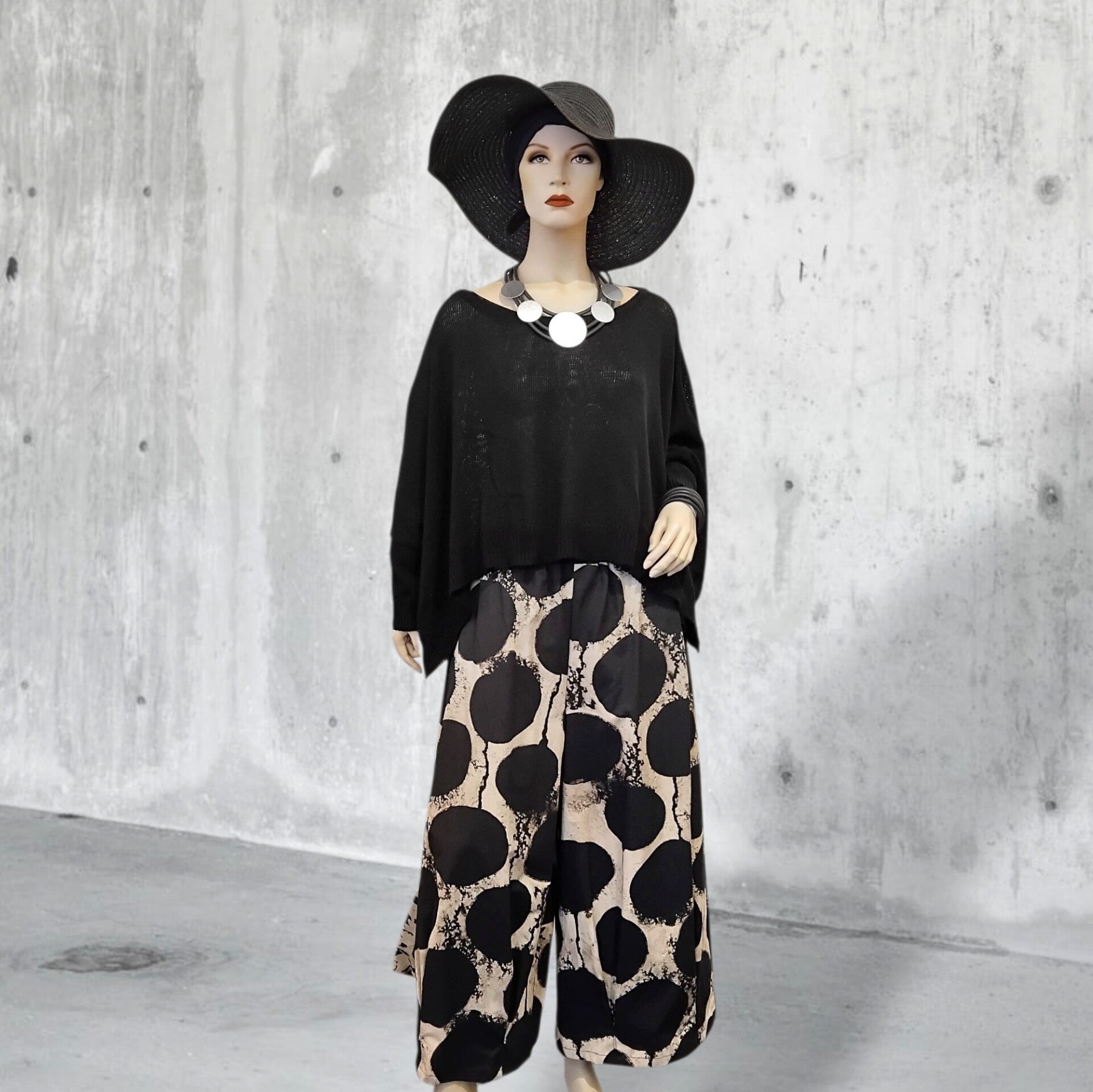 Der Pulli ist ein absoluter Allrounder und ein Multitalent bezüglich seiner Kombienierbakeit: solo als kurzer weiter Pulli zu einem Rock oder weit geschnittener Hose, oder in Kombination mit eine Bluse, die unter dem Pulli hervorblitzt, oder als Überwurf über ein ärmelloses Kleid, eine ärmellose Tunika usw.