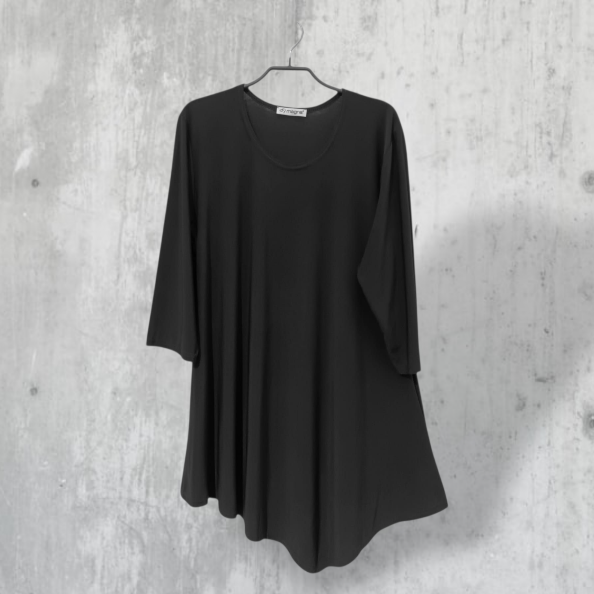 Dieses asymetrisch geschnittene, schwarze Oberteil von dem bekannten Label "Magna" ist in figurschmeichelnder A-Linie geschnitten und überzeugt mit vielseitiger Verwendbarkeit.
