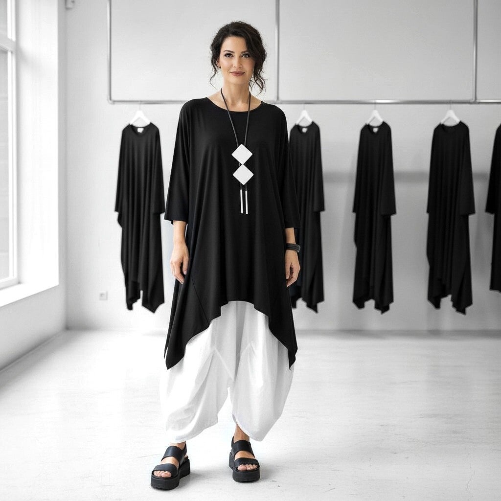 Dieses zeitlose, schwarze Oberteil von dem bekannten Label "Magna" ist in figurschmeichelnder A-Linie mit zipfeligem Verlauf geschnitten.