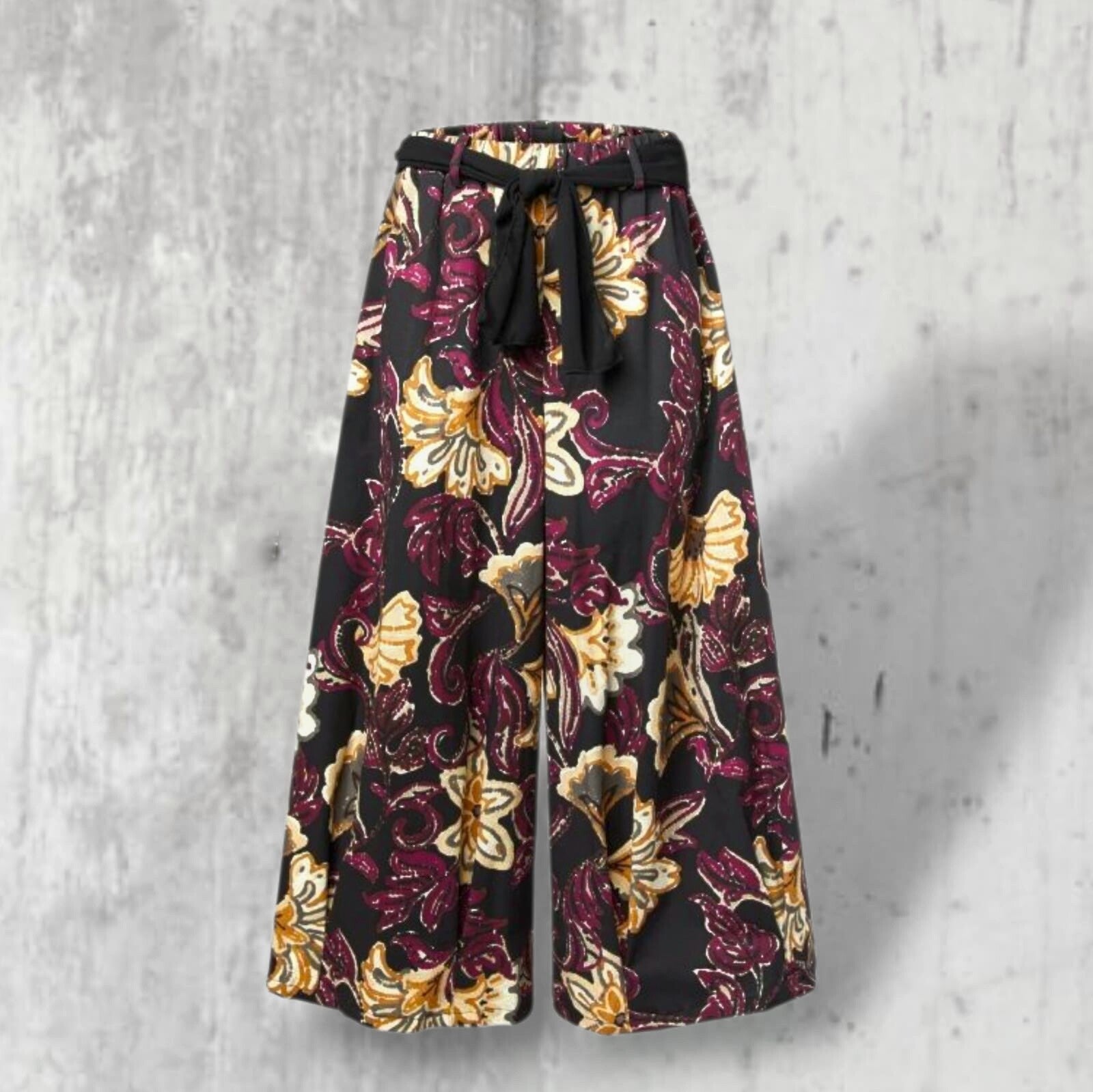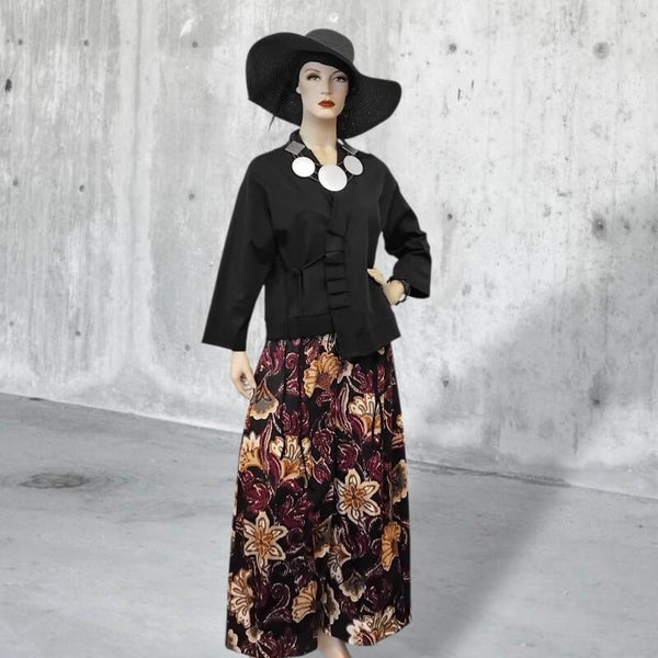 Diese formschöne, schwarz-bunte Hose mit Gummibund & Bindegürtel ist quasi das ganze Jahr über tragbar, in der kühleren Jahreszeit, eventuell mit einer Strumpfhose "drunter". Das Material, bestehend aus einer hochwertigen Baumwoll-Mischfaser bietet einen optimalen Tragekomfort und garantiert durch den Elastananteil eine bequeme Passform.