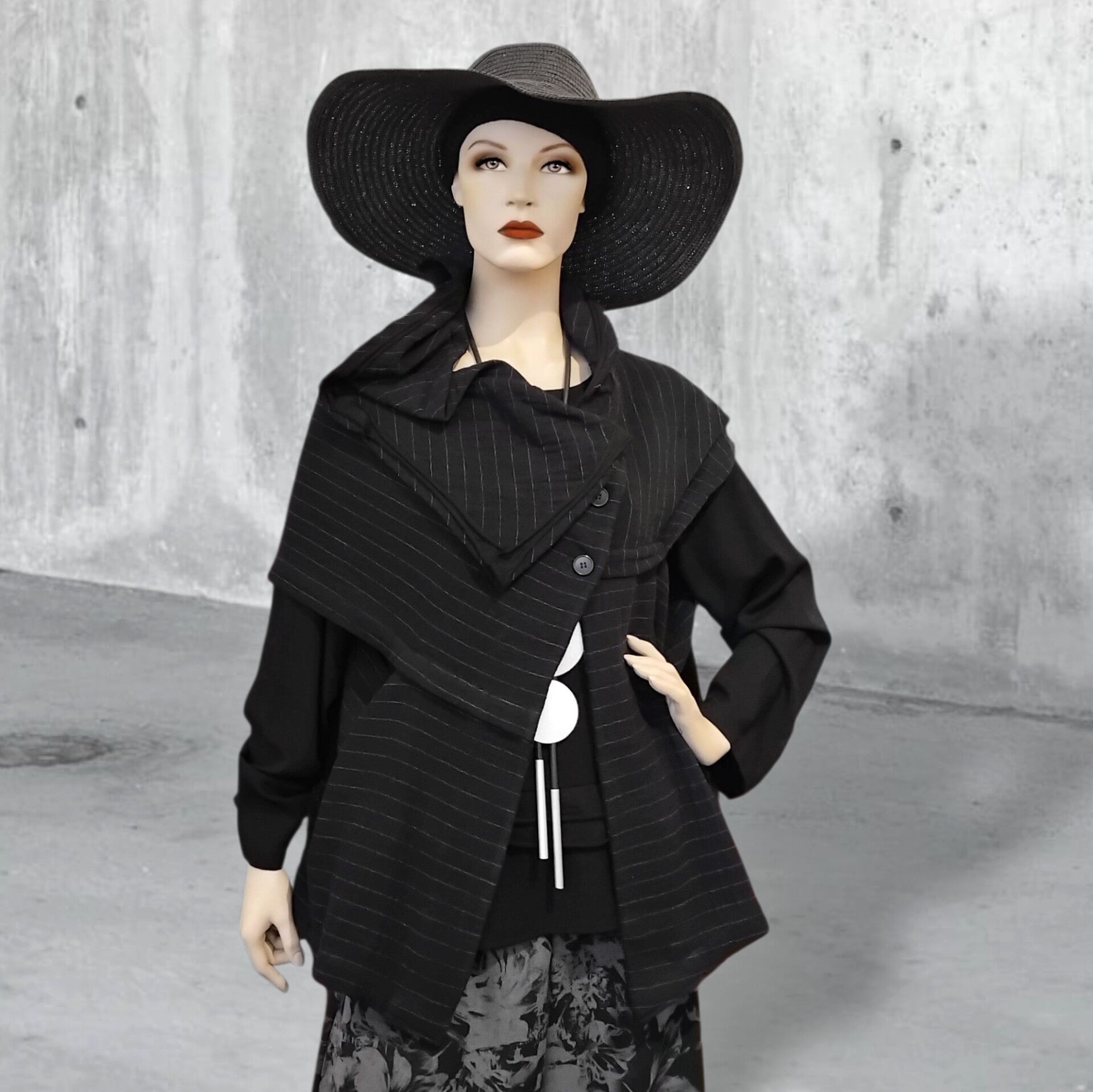 Beispiel-Kombie: Ein schlichtes Kleid als Basis und diese sehr coole, schwarze Weste mit den feinen grauen Nadelstreifen "on top" wäre eine super coole Outfit-Idee oder so, wie auf den Fotos, mit einer Hose-Shirt-Kombie