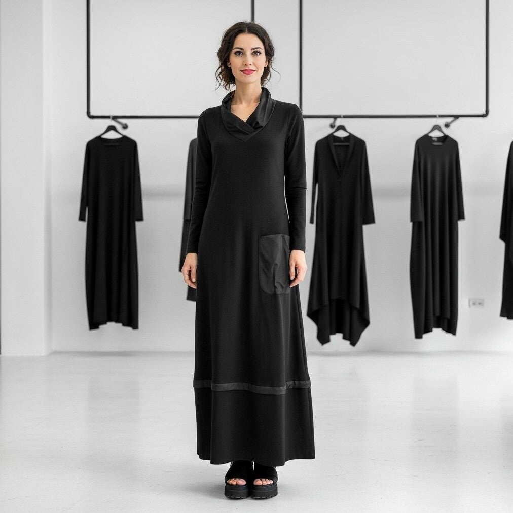 Das Kleid einen formschönen Kragen aus edel wirkenden Taft-Material, eine aufgesetzte Tasche und eine effektvolle Quernaht, die ebenfalls aus dem Taft-Material bestehen.