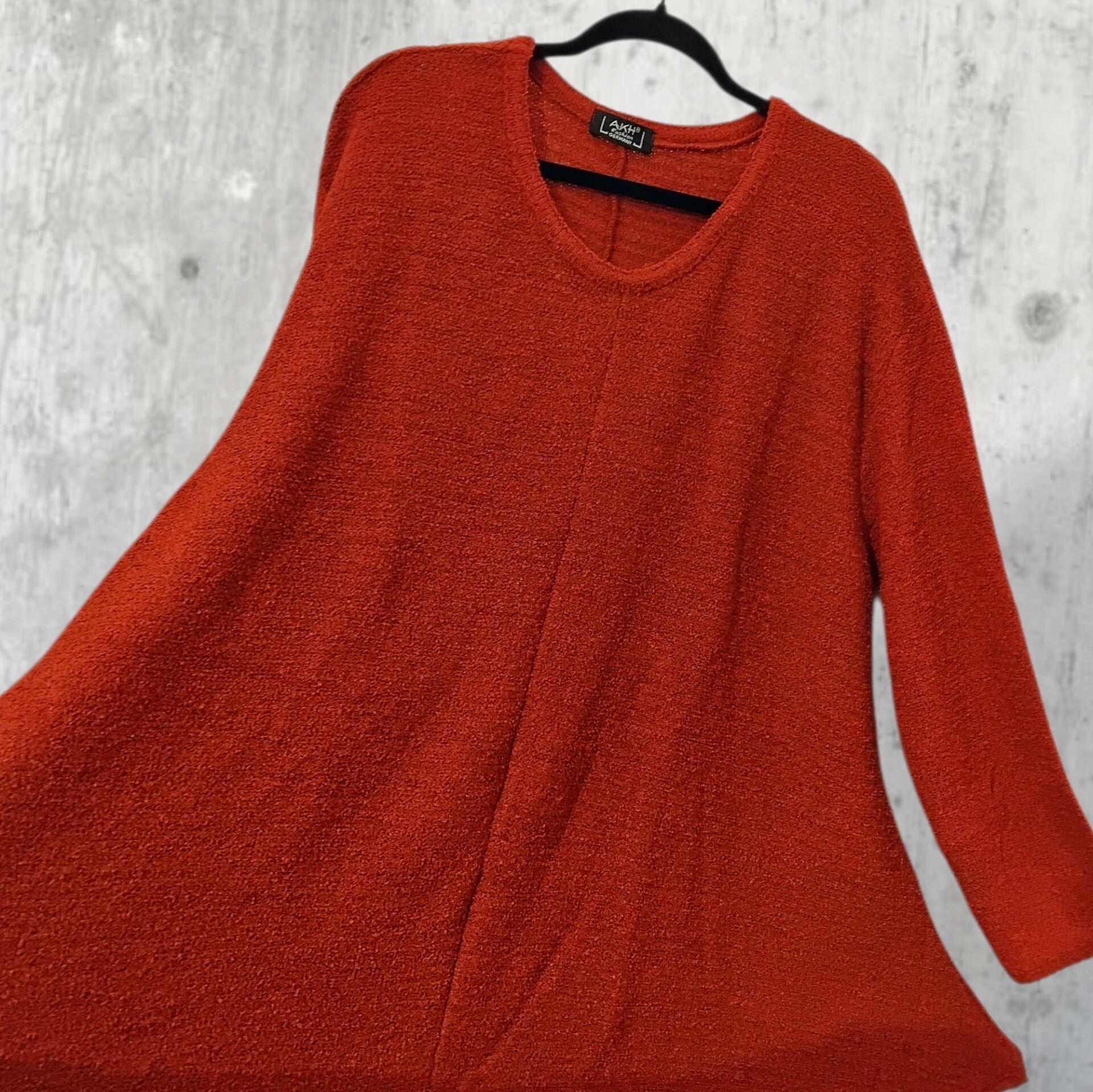 Dieser zeitlose, rostorangefarbende Bouclé-Strick Pulli von "AKH" Ist in modischer A-Linie mit gemütlicher Weite geschnitten.