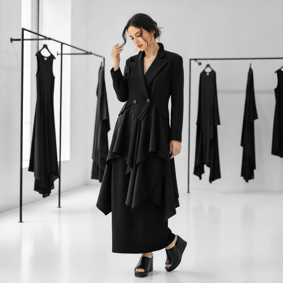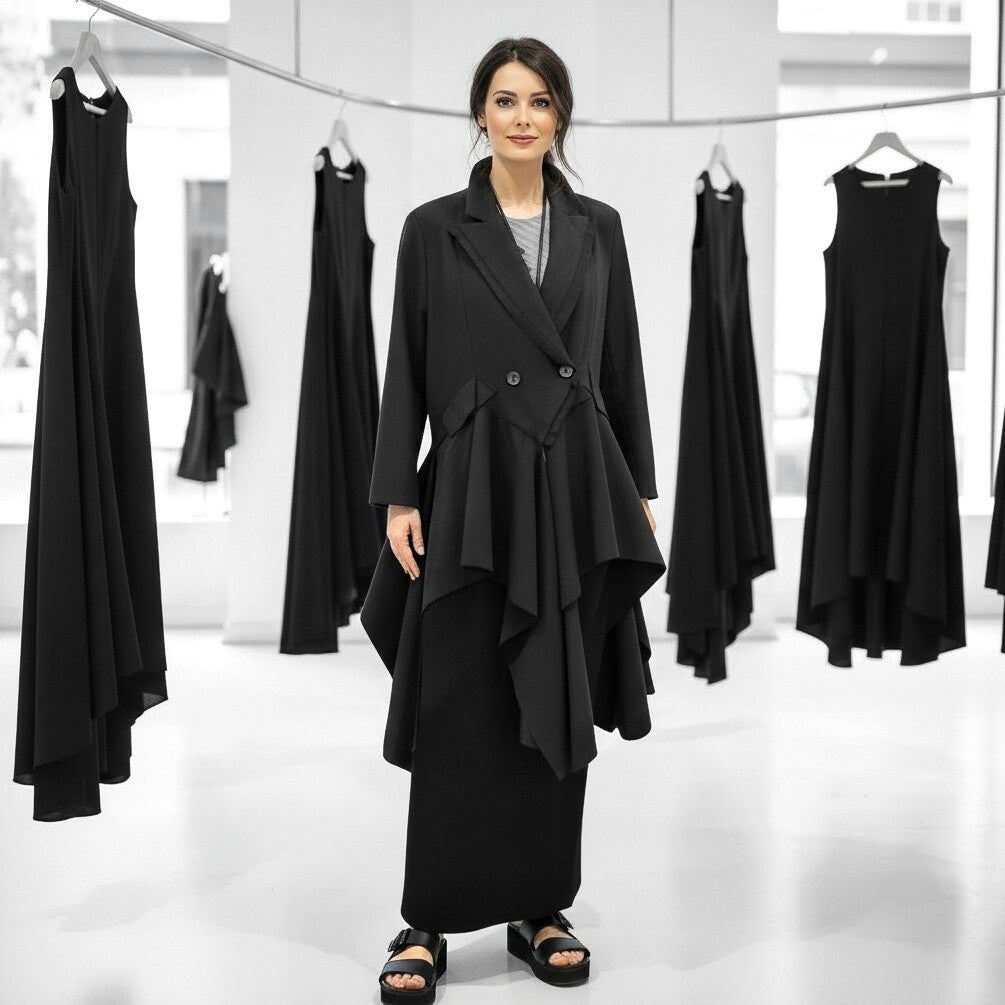 Dieser außergewöhnliche, schwarze Blazer ist in figurschmeichelnder A-Linie mit zipfeligem Verlauf geschnitten.