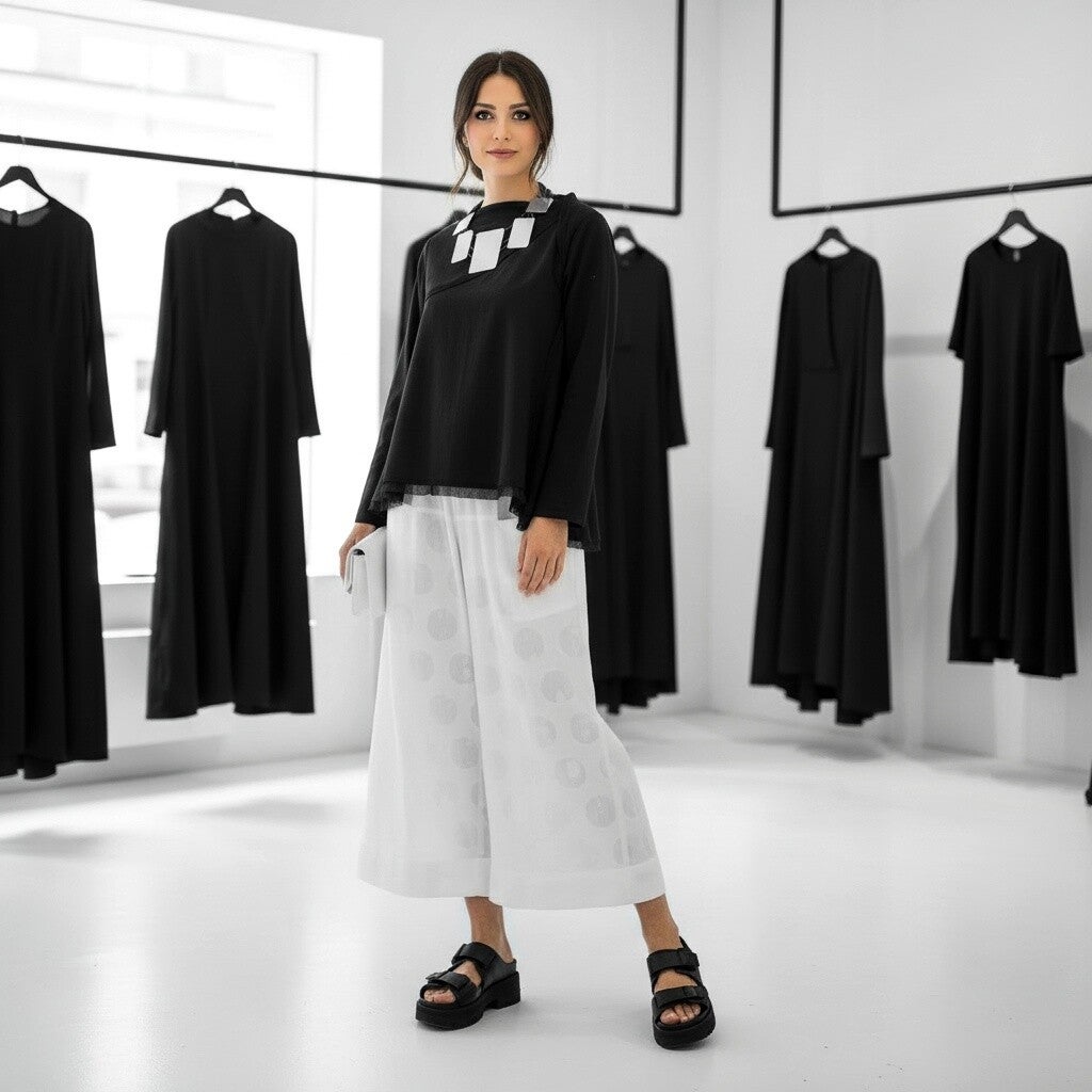 Die coole, weiße Culotte ist Dank des Gummibundes herrlich bequem und punktet ausserdem mit dem super angenehmen Material, welches ideal für den Sommer ist. Die Culotte ist in sich gemustert, sie hat große runde Dots in weiss.