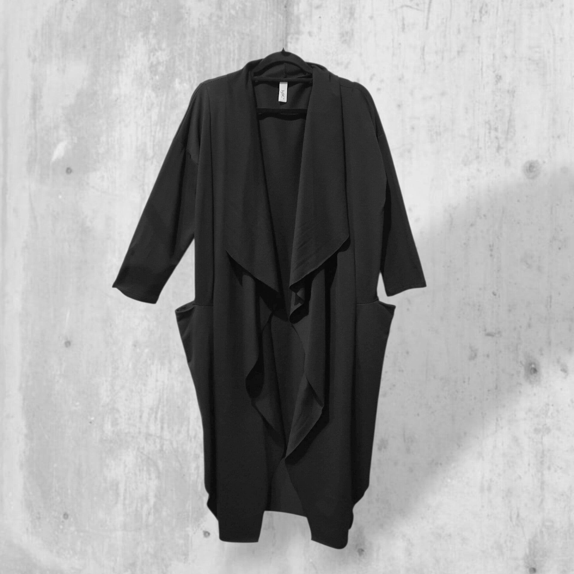 Dieser coole, schwarze Sweaty Mantel ist quasi ein "Strickmantelersatz" . Er ist ein absoluter Allrounder und vielseitig tragbar. Beispielsweise als "Casuble" in Kombination mit einem Kleid, so wie es unser Model trägt.