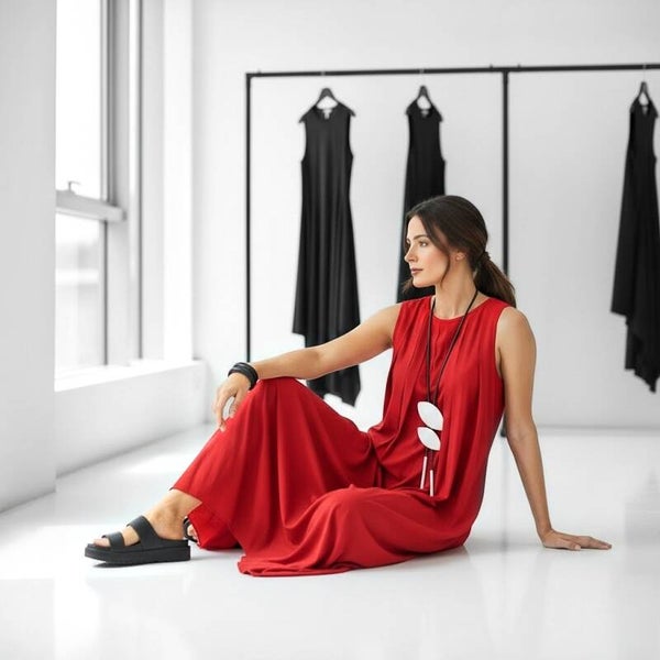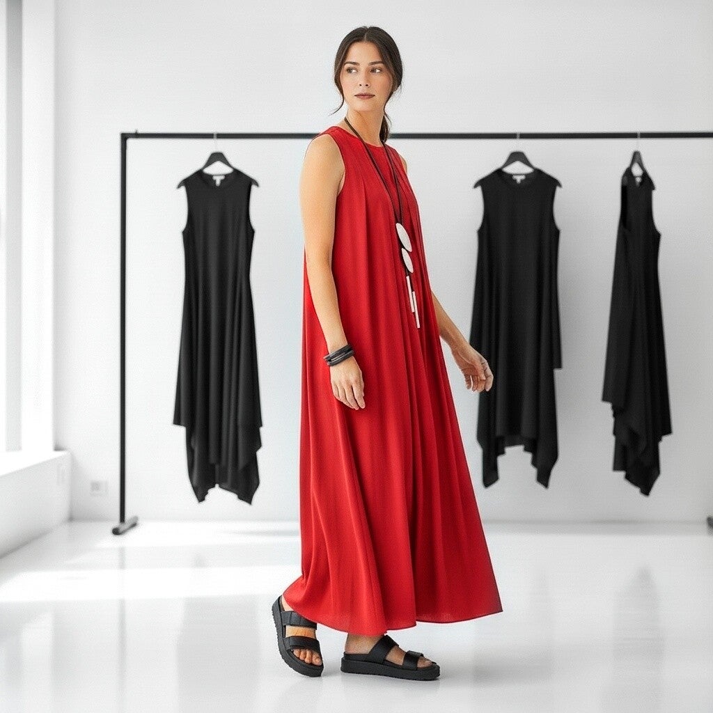 Dieses arpate, rote Kleid ist in zeitloser A-Linie geschnitten und punktet mit vielseitiger Verwendbarkeit.