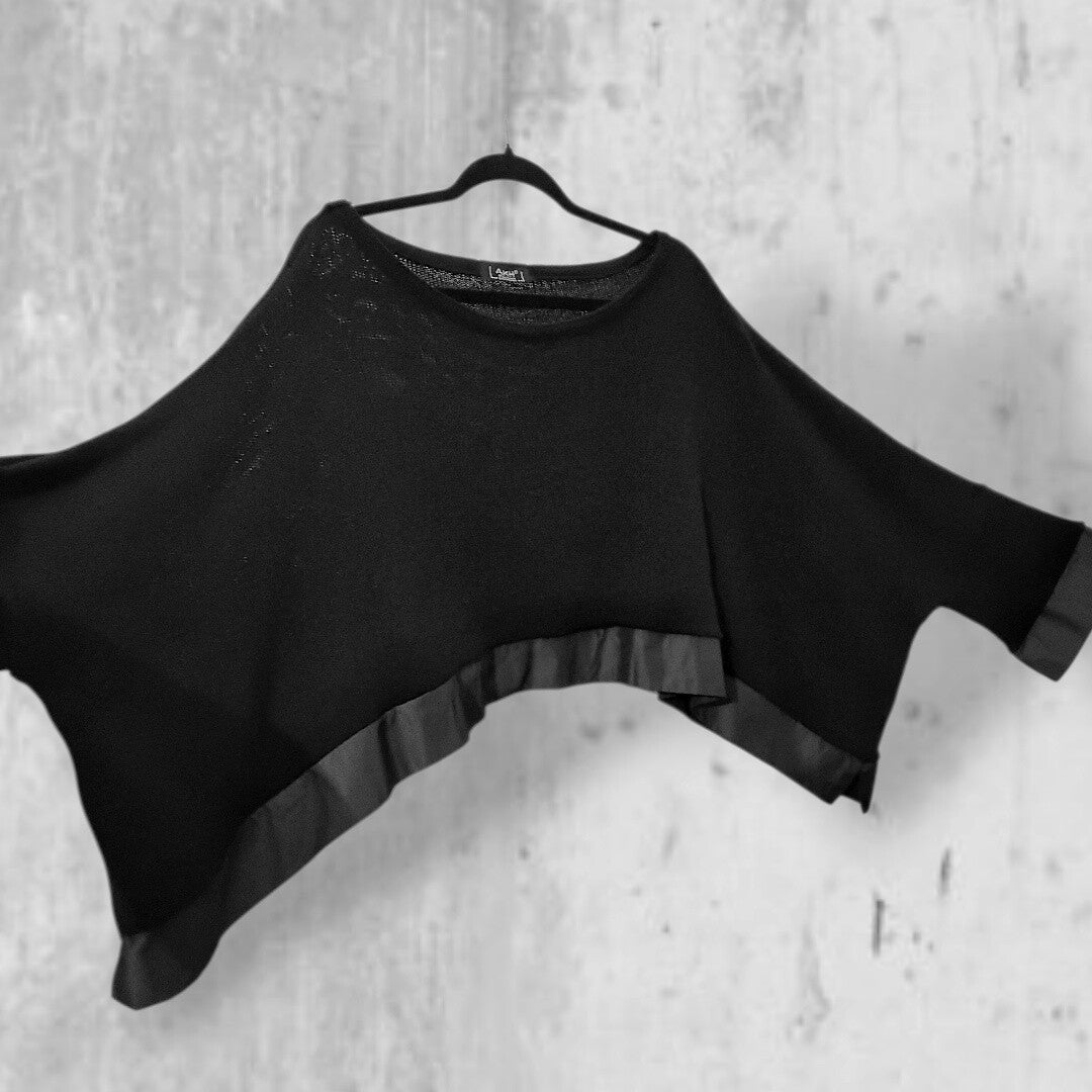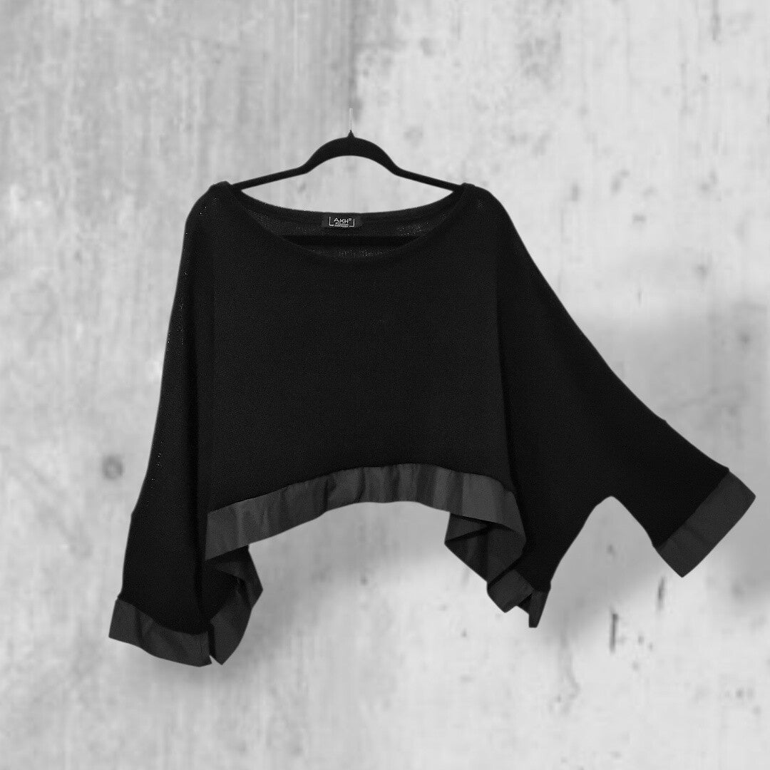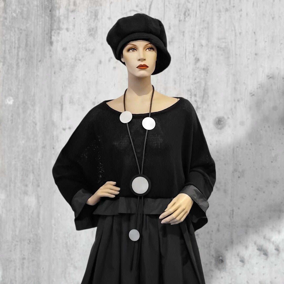 Der Pulli ist ein absoluter Allrounder und ein Multitalent bezüglich seiner Kombienierbakeit: solo als kurzer weiter Pulli zu einem Rock oder weit geschnittener Hose, oder in Kombination mit eine Bluse, die unter dem Pulli hervorblitzt, oder als Überwurf über ein ärmelloses Kleid, eine ärmellose Tunika usw.