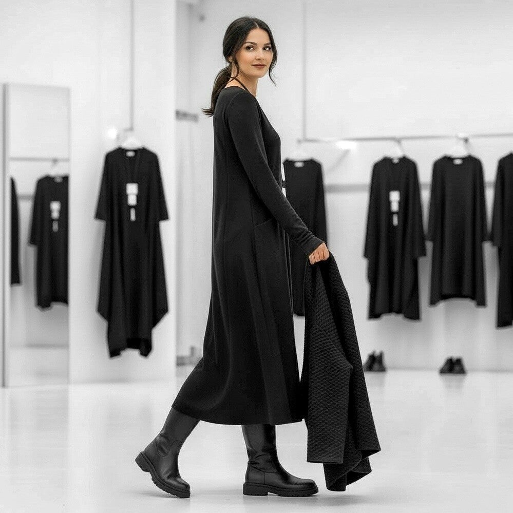 Das Kleid ist in gemütlicher Tulpenform geschnitten, es hat raffinierte Teilungsnähte, in denen im Vorderbereich zwei Eingrifftaschen integriert sind.