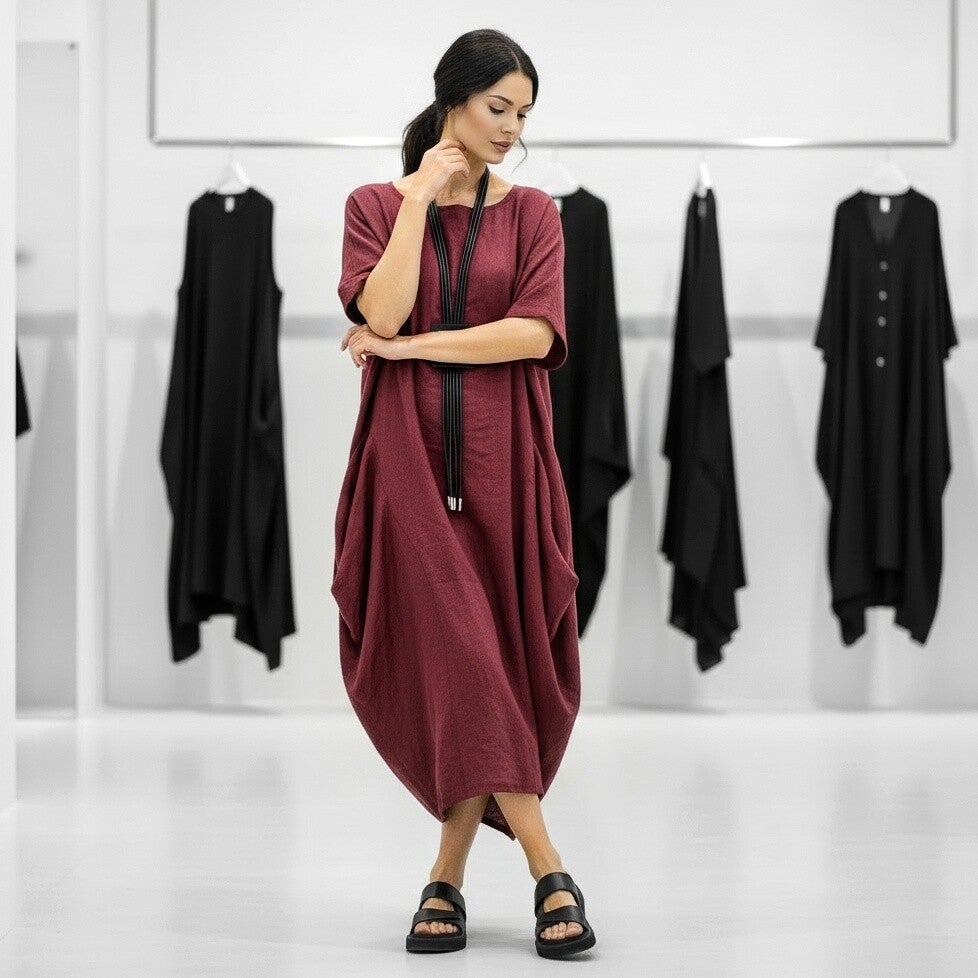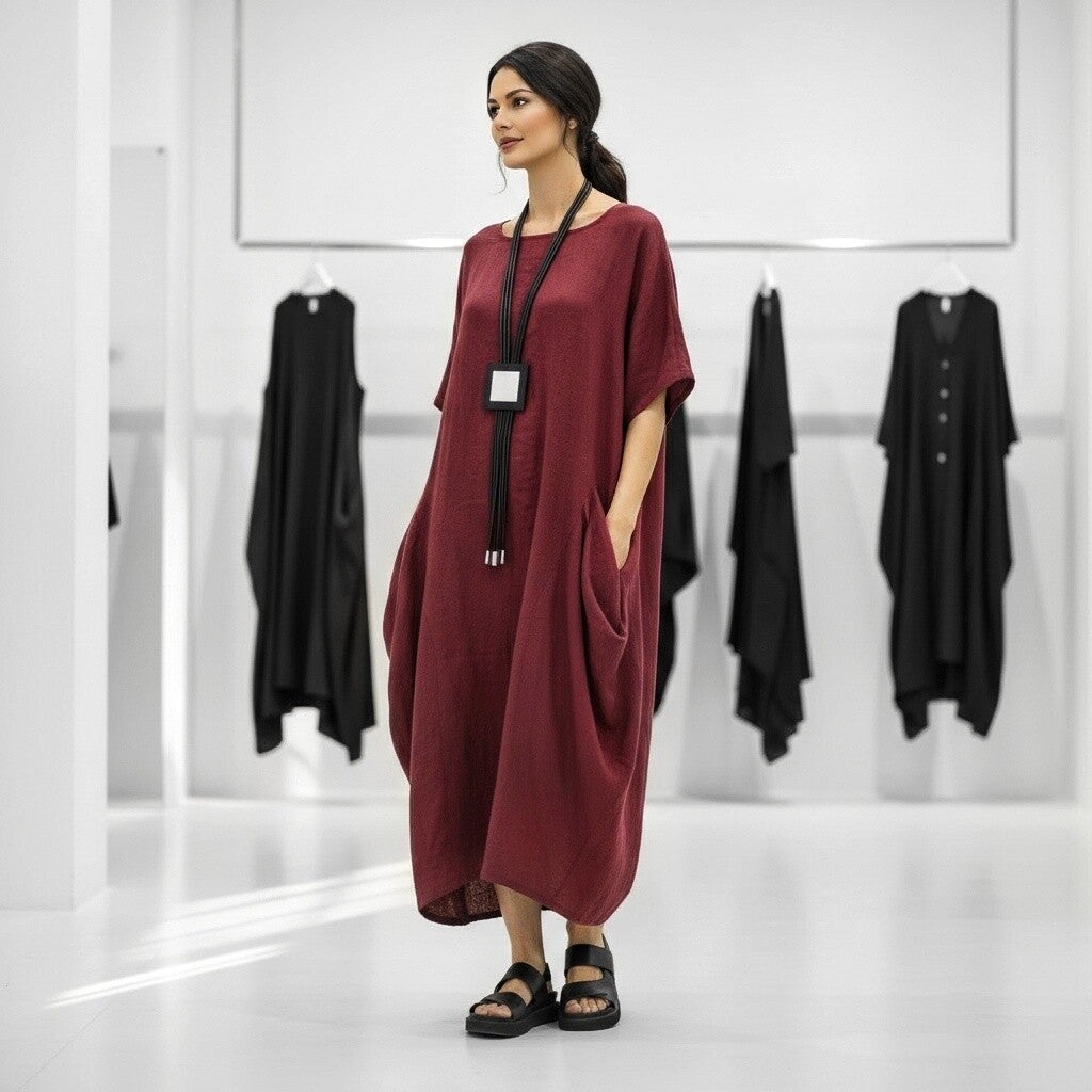 Leinen Kleid in gemütlicher Tulpenform in aubergine