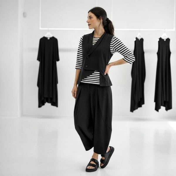 Diese raffiniert geschnittene, schwarze Weste überzeugt mit vielseitiger Kombienierbakeit, zu einem schlichten T - Shirt oder auch mit einer schicken Bluse, ist diese Weste absolut auch Büro - tauglich.