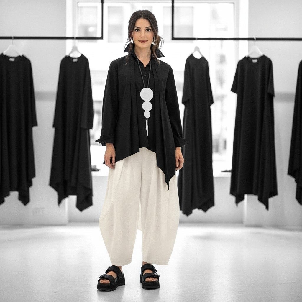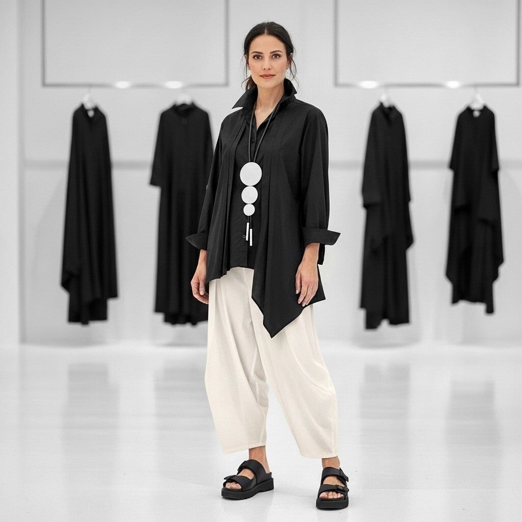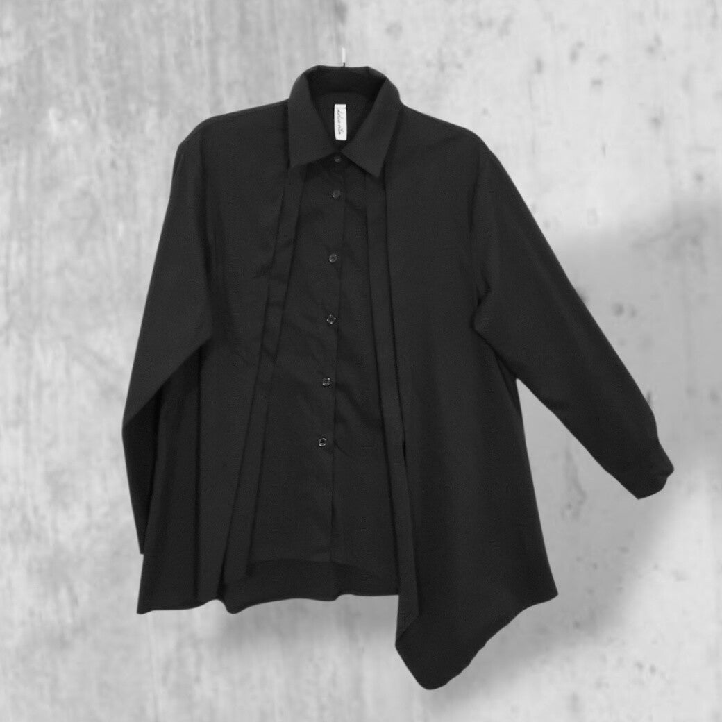Diese coole, schwarze Bluse ist in leicht angedeuteter A-Linie mit asymmetrischem Verlauf geschnitten.