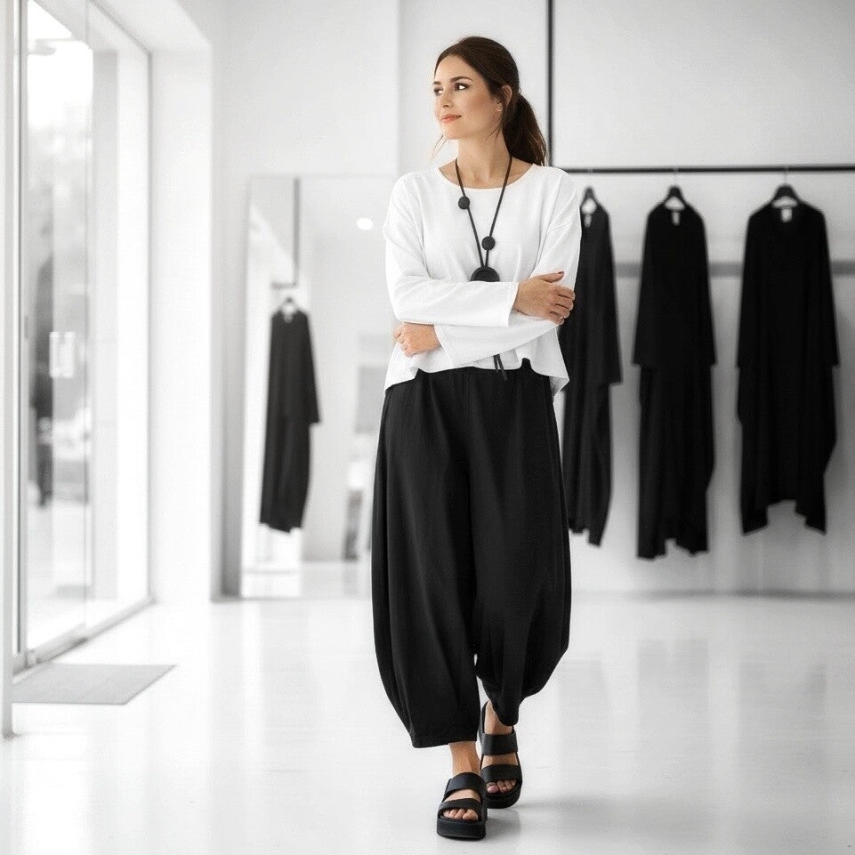 Die Hose ist in modischer Tulpenform geschnitten, sie hat zwei seitliche Eingrifftaschen, die in die Seitennähte integriert sind, sowie raffiniert plazierte Falten, die oberhalb des Saumabschlusses angebracht sind.