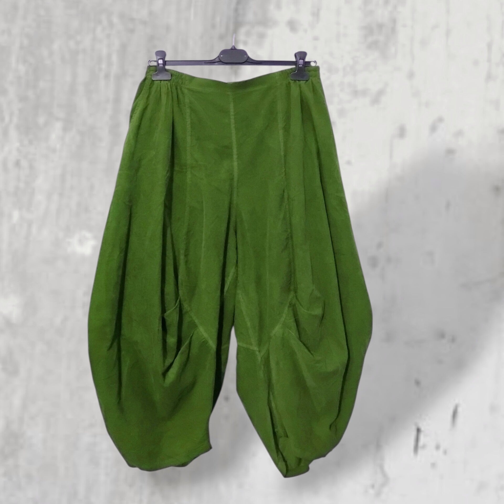 Diese sehr coole, grasgrüne Hose in gemütlicher Feinkord Qualität, ist in modischer Tulpenform mit extra großzügiger Weite gefertigt.