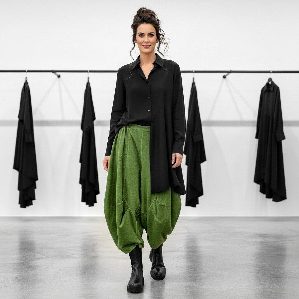 Diese Hose hat einen komfortablen Gummibund, daher ist sie von der Passform sehr flexibel und bequem, zusätzlich hat sie zwei zweckmäßige Eingrifftaschen die in den Seitennähten integriert sind. Ganz besonders auffallend ist die raffinierte Schnittführung, die der Hose eine super stylishe Note verleiht.