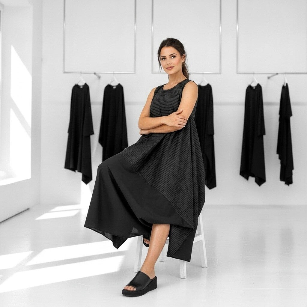 Dieses exklusive Kleid ist in modischer A-Linie geschnitten und überzeugt mit einfallsreichem Design. Die sehr aufwendige Machart und die Kombination zweierlei Stofffarben verleihen dem Kleid eine avantgardistische Note.