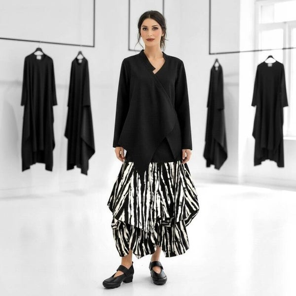 extravaganter Rock mit Raffbändchen in schwarz-weiß gemustert