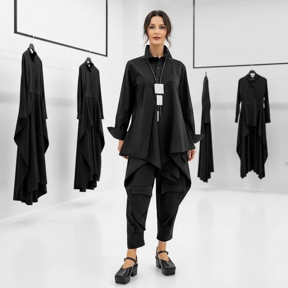 Diese extravagante, schwarze Bluse überzeugt mit kreativer Schnittführung. Sie hat eine schräg verlaufende Knopfleiste, eine kleine Ziertasche über dem Brustbereich und ist im Vorderteil asymmetrisch geschnitten.