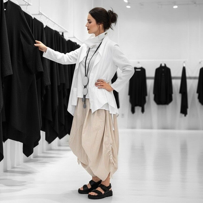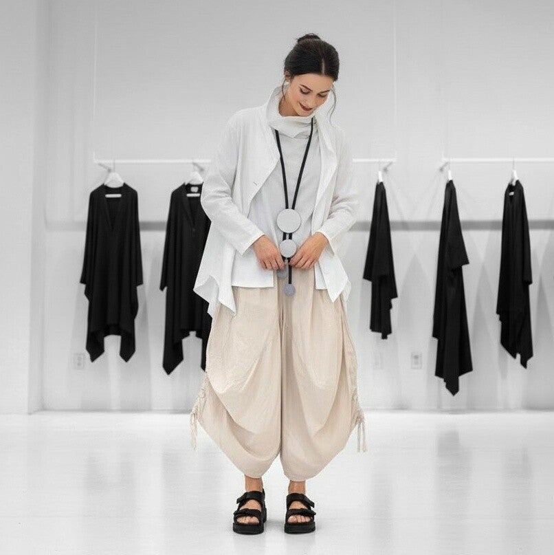 Der Hosenrock hat einen komfortablen Gummibund, zwei Eingrifftaschen die in die Seitennähte integriert sind und zwei seitlich an den Hosenbeinen angebrachte Raffbändchen, die bei lockerer Raffung ein schönes tulpenförmiges Volumen erzeugen.