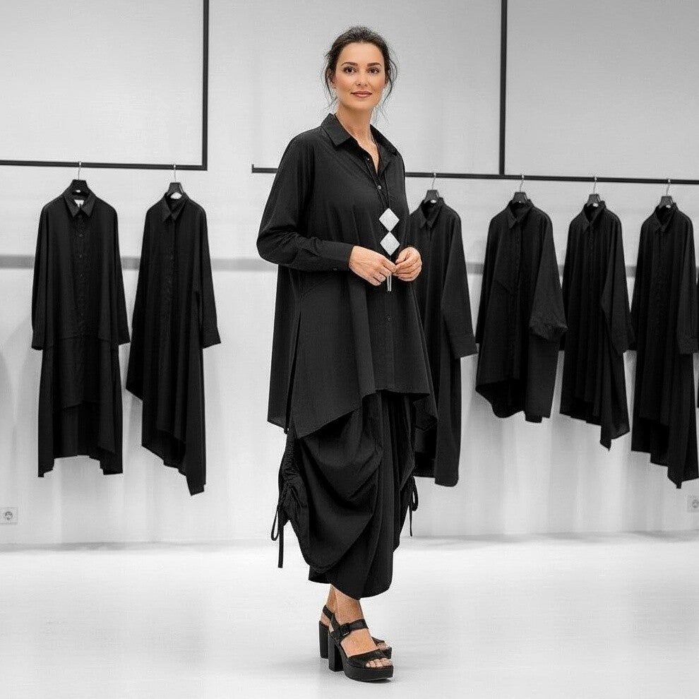 Der Hosenrock hat einen komfortablen Gummibund, zwei Eingrifftaschen die in die Seitennähte integriert sind und zwei seitlich an den Hosenbeinen angebrachte Raffbändchen, die bei lockerer Raffung ein schönes tulpenförmiges Volumen erzeugen.