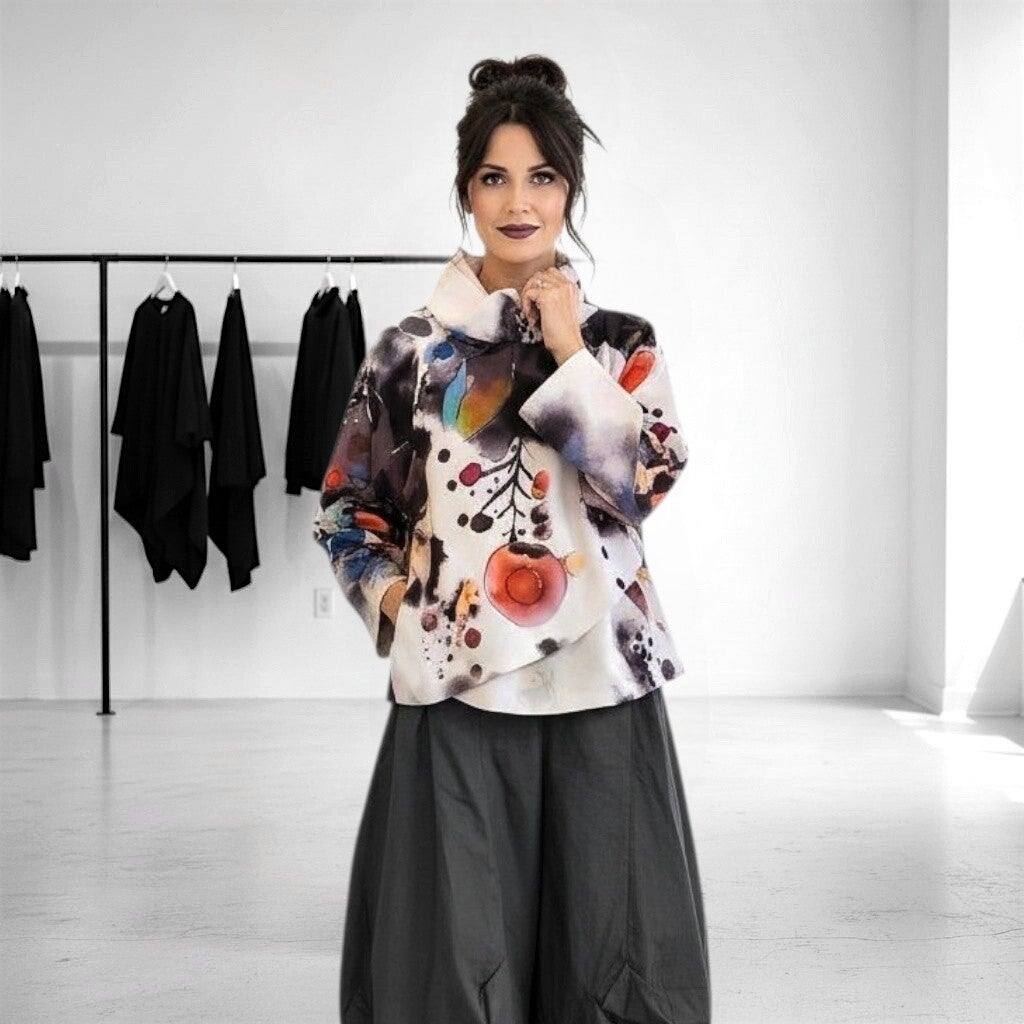 Diese elegante, kurze Jacke in sommerlichem Farbmix, ist im Vorderbereich asymmetrisch geschnitten und wird seitlich außen, sowie zusätzlich auch innen, mit je einem Knopf geschlossen. Die Jacke hat außerdem ein leichtes Innenfutter und ist super angenehm zu tragen.
