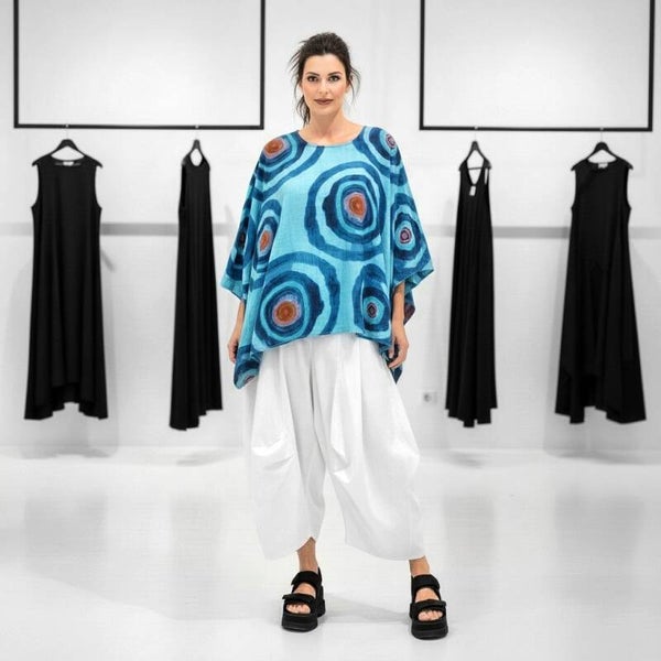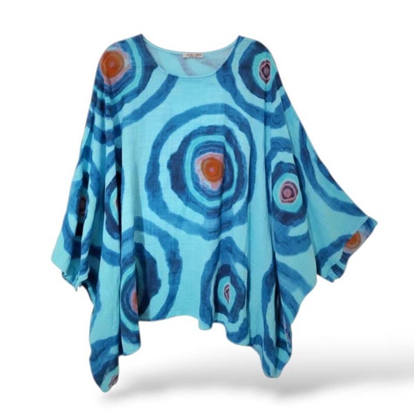 Dieses sehr großzügig geschnittene, sommerliche Oberteil in farbenfrohen aqua - Tönen ist modischer Kastenform geschnitten.