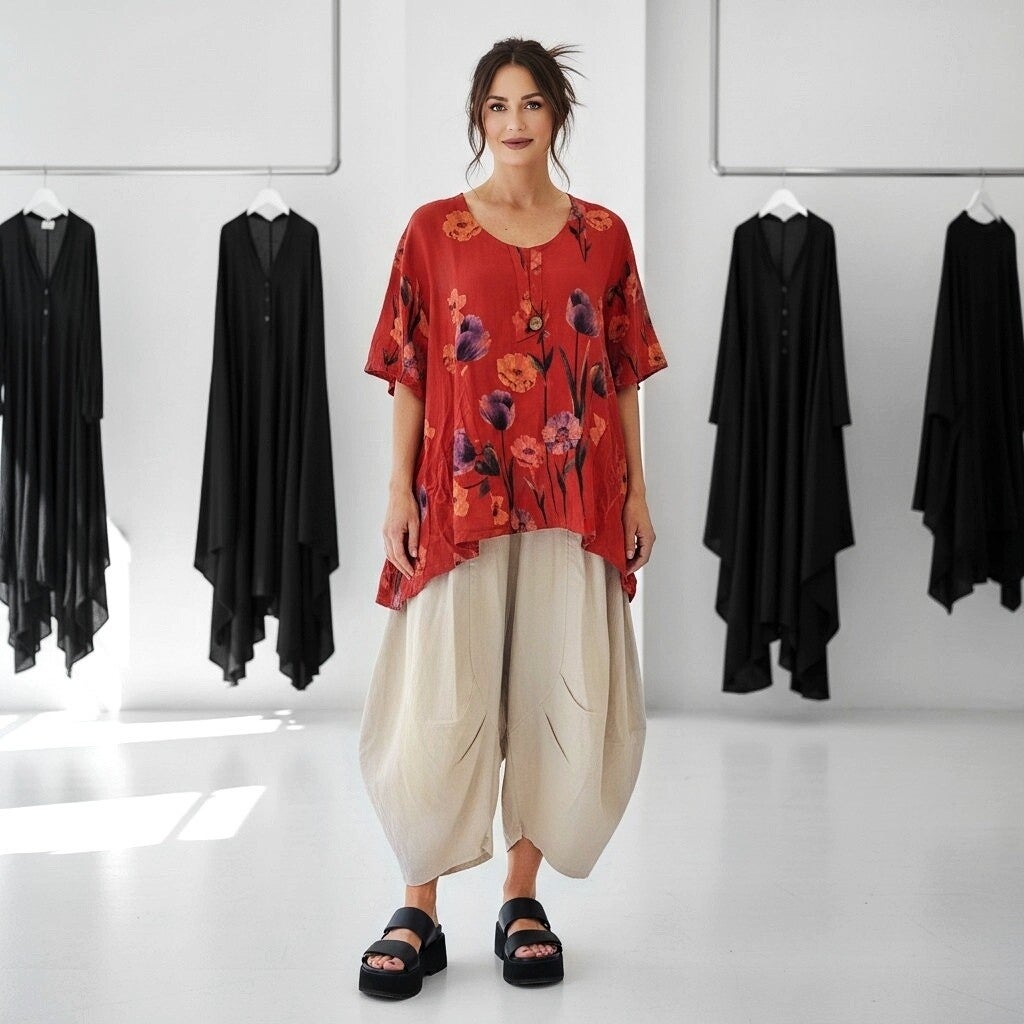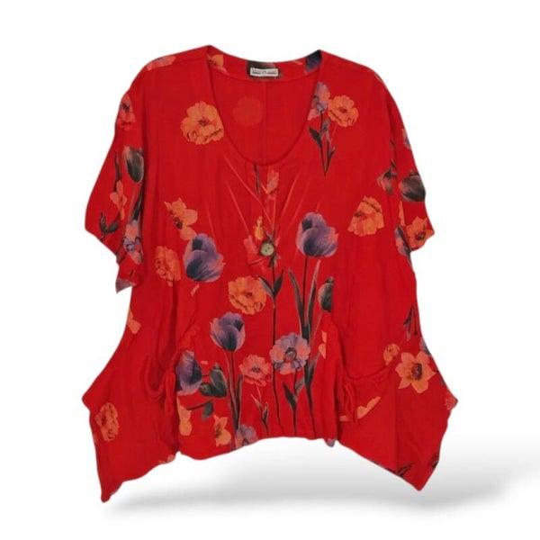 Leinen Oberteil in modischer A-Linie mit floralem Muster in rot