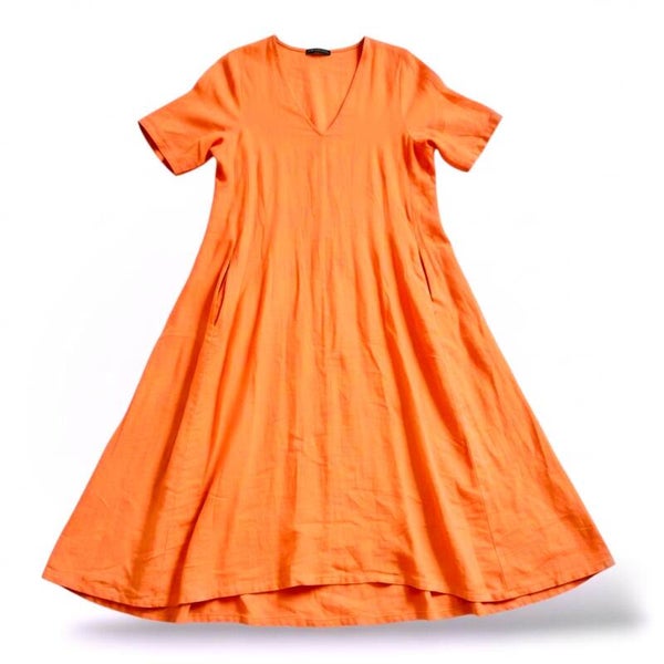 Dieses lässige Leinen Kleid in sommerlich, frischem, orange ist in figurschmeichelnder A-Linie mit großzügiger Weite geschnitten. Das Kleid hat einen formschönen V-Ausschnitt und zwei Eingrifftaschen die raffiniert in die Seitennähte integriert sind.